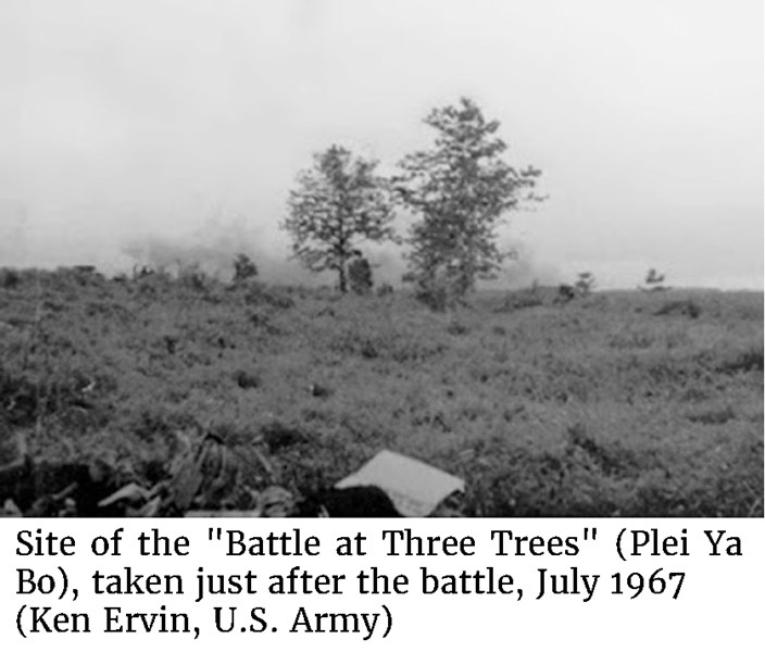 SOURCES: “Combat Operations After Action Report,” Headquarters, 3d Battalion, 8th Infantry, Ivy Dragoons, August 1, 1967; Charles Bracelen Flood, The War of the Innocents, McGraw Hill, New York, 1970; Glenn F. Williams, The U.S. Army Campaigns of the Vietnam War: Taking the Offensive, October 1966-September 1967, Center of Military History, United States Army, Washington, D.C., 2016; Ken Ervin, “Ambush in Plei Ya Bo,” CherriesWriter, January 26, 2020 (accessed July 19, 2024); Ken Ervin, “The Battle for Plei Ya Bo (Three Trees),” and “Photo ‘After Our Battle at Three Trees,’" Ken 'N' Viet Nam, January 14, 2007 (accessed July 19, 2024); “Wall of Faces,” Vietnam Veterans Memorial Fund (accessed July 18, 2024); “The Virtual Wall,” Vietnam Veterans Memorial Wall (accessed July 18, 2024); Coffelt Database of Vietnam Casualties (accessed July 18, 2024)