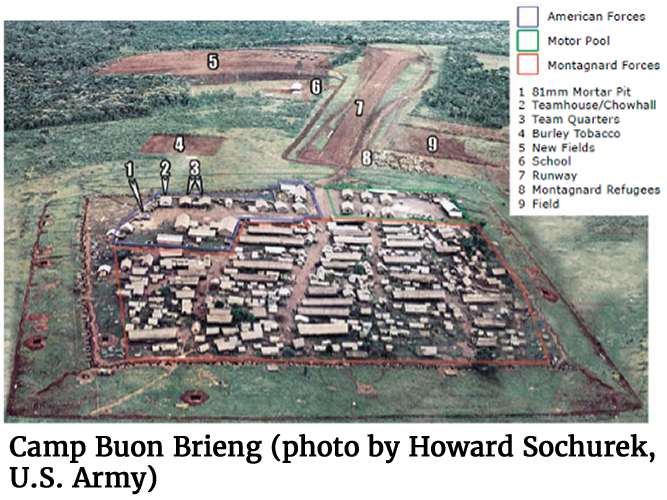 Photo of Camp Buon Brieng (photo by Howard Sochurek, U.S. Army)Early in 1964, Team A-312, Company C, 1st Special Forces Group on Okinawa deployed to Vietnam for a six-month TDY. Team members were handpicked and had been specially trained for the mission. One particularly interesting facet of their standard pre-deployment training was called “compatibility week.” According to the team captain, “The entire team spent a week playing pinochle. Twice a day, the communications sergeants made a radio check with company headquarters. The purpose of the exercise was to find out whether all twelve men could live in an isolated environment as a team without killing each other.”