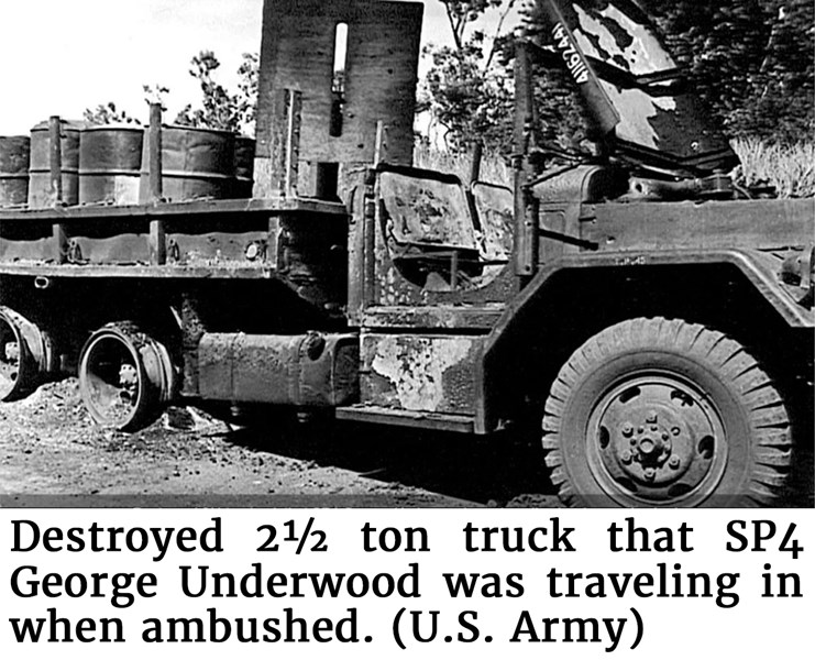Destroyed 2½ ton truck that SP4 George Underwood was traveling in when ambushed. (U.S. Army)On July 23, 1964, the A-312 junior medic was leading a convoy hauling building supplies for the school project back to camp from Ban Me Thuot. The convoy reportedly included a heavily armed platoon-sized CIDG Montagnard strike force and several Vietnamese Special Forces soldiers for protection, a contingent of unarmed Chinese Nung laborers coming to assist with building the school, and a number of women and children. As they neared Buon Brieng, the four trucks encountered a well-prepared and well-orchestrated ambush by a battalion of VC insurgents. SF Soldiers at the camp immediately mobilized a reaction force to rescue the beleaguered convoy, and were soon reinforced by a nearby patrol that hurried to the sound of the guns.