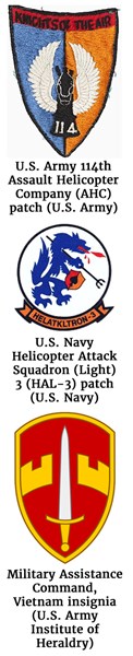 Insignias patches of the U.S. Army 114th Assault Helicopter Company patch, the U.S. Navy Helicopter Attack Squadron (Light) 3 (HAL-3) (U.S. Navy) and the Military Assistance Command, Vietnam (U.S. Army Institute of Heraldry).