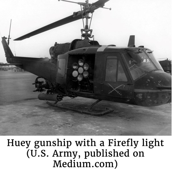 Photo of a Huey gunship with a Firefly light (U.S. Army, published on Medium.com)To counter the freedom of movement Viet Cong units enjoyed at night, helicopter companies incorporated nighttime armed reconnaissance/search and destroy missions. Three helicopter gunships would fly out at low altitude to suspected enemy hotspots; one would drop flares, and the other two would shoot at anything that moved. Unfortunately, the flares also illuminated the helicopter silhouettes, providing the enemy with pretty clear targets.