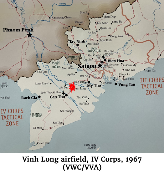 Map of the Vinh Long airfield, IV Corps, 1967 (VWC/VVA)SUMMARY: In the early morning of August 1, 1967, after several hours flying “firefly” missions, three U.S. Army Huey helicopter gunships returned to Vinh Long Army Airfield (also known as Shannon-Wright Compound), approximately 60 miles southwest of Saigon on the banks of Co Chien branch of the Mekong River in IV Corps. Two of the aircraft reached the airfield and landed without incident; the command and control UH-1C helicopter (tail number 66-00651), caught in a violent storm, crashed just before 2:00 a.m. Four of the five men aboard were killed in the crash. One Soldier, though injured, survived.