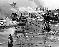 1Henry Stewart (2004). The Impact of the USS Forrestal's 1967 Fire on United States Navy Shipboard Damage Control (Master's Thesis, United States Army Command and General Staff College Fort Leavenworth, KS, 2008) pp. 2-4, 36-8, 91 ; Edward J. Marolda, Ready Seapower: A History of the U.S. Seventh Fleet (Wash DC: Naval History and Heritage Command, 2012), pp. x, 61; "The Forrestal Fire," http://www.navy.mil/navydata/nav_legacy.asp?id=73 (accessed 4/8/14); Spencer C. Tucker, ed., The Encyclopedia of the Vietnam War: A Political, Social, and Military History (2nd edition; Santa Barbara, Calif: ABC-CLIO, 2011), pp. 27, 379; NavSource Online: Aircraft Carrier Photo Archive, The Forrestal Fire, found 7/23/2015 at http://www.navsource.org/archives/02/cv-59/59f-0729.htm.