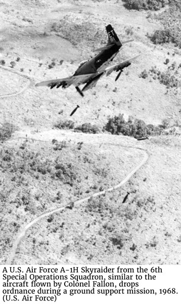A U.S. Air Force A-1H Skyraider from the 6th Special Operations Squadron, similar to the aircraft flown by Colonel Fallon, drops ordnance during a ground support mission, 1968. (U.S. Air Force)In 1968, Fallon volunteered to go to Southeast Asia as the Vice Commander of the U.S. Air Force 56th Special Operations Wing, 7th Air Force, which flew secret missions against Communist insurgents in Laos. The unit was based in Thailand and flew mostly older, prop-driven A-1 Skyraiders—an ideal aircraft for low altitude ground attacks and reconnaissance. Fallon left for Thailand shortly after the birth of his second daughter. He successfully flew another hundred-plus combat missions in Southeast Asia, but on July 4, 1969, he flew his last.