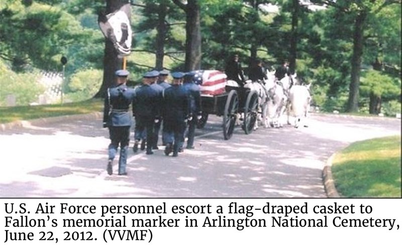 U.S. Air Force personnel escort a flag-draped casket to Fallon’s memorial marker in Arlington National Cemetery, June 22, 2012. (VVMF)Fallon’s family was faced with the painful likelihood of never knowing the exact fate of their husband and father. Jean Fallon later recalled she held out hope that Patrick survived for a long time, but after the Pathet Lao overthrew the government in Vientiane in 1975, that hope dimmed. The Department of Defense transitioned Fallon’s status from missing in action to killed in August 1979. The Defense POW/MIA Accounting Agency (DPAA) declassified Fallon’s final mission and status in 1998. DPAA continues to actively search for his remains today. In 2012, Jean Fallon and her family at long last held a memorial for Patrick at Arlington National Cemetery. The service took place in the same chapel in which they were married. At the time, she emphasized she would never give up hope of finding Patrick’s remains, but “the time [for a memorial] had come. I just felt that I had done what I was able to do and the rest of it has to be up to the Air Force and their program to locate and identify the ones who haven’t come home.” Fallon was a recipient of the Distinguished Flying Cross, the Bronze Star medal for valor, and two Purple Heart medals. He is listed on Panel 21W, Line 59, of the Vietnam Veterans Memorial in Washington, D.C.1
