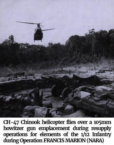 Photo of a CH-47 Chinook helicopter flies over a 105mm howitzer gun emplacement during resupply operations for elements of the 1/12 Infantry during Operation FRANCIS MARION (NARA)
