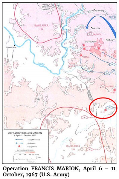 FULL STORY: The U.S. Army’s 4th Infantry Division, initially augmented by the 25th Infantry Division’s 3d Brigade and later by the 173d Airborne Brigade, commenced Operation FRANCIS MARION on April 6, 1967. The operation’s primary mission, like its predecessor Operation SAM HOUSTON, was to protect the three Central Highlands provinces bordering Cambodia (Darlac, Pleiku, and Kontum) in northern II Corps from North Vietnamese Army (NVA) incursions. From safe havens just over the border in Cambodia, the NVA was harassing the region.
