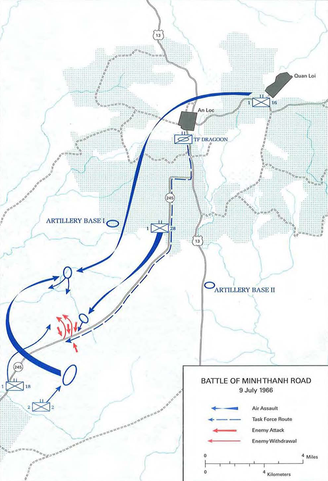 Map illustrating the 1st Infantry Division's fight on the Minh Thanh Road, July 9, 1966. (Center of Military History)