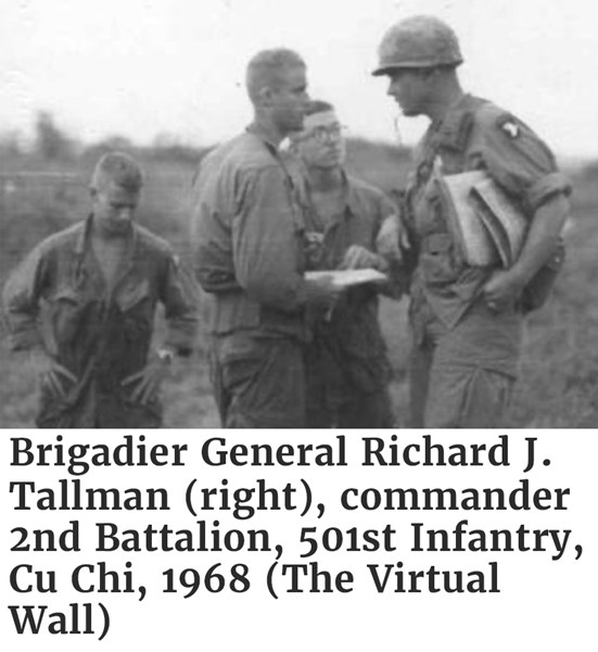 • Photo of Brigadier General Richard J. Tallman (right), commander 2d Battalion, 501st Infantry, Cu Chi, 1968 (The Virtual Wall)Brigadier General (BG) Richard J. Tallman, deputy commanding general of TRAC and deputy senior adviser in MR-3, was born on March 28, 1925 in Honesdale, Pennsylvania. Tallman was one month into his third tour in Vietnam. He had been awarded the Silver Star Medal for gallantry in action while commanding an airborne battalion in 1968. He was 47 years old, married, and the father of seven children.