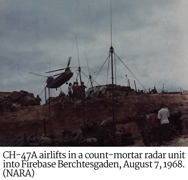 after extensive reconnaissance and surveillance, North Vietnamese Army (NVA) sappers attacked elements of the 101st Airborne Division (Airmobile) at Fire Support Base (FSB) Berchtesgaden using rocket propelled grenades, small arms fire, 82 millimeter mortars and satchel charges. The NVA sappers successfully crossed the perimeter concertina wire and focused their assault on the 3d Brigade’s headquarters complex, command post, and tactical operations center (TOC) on Hill 1030, as well as the 2d Battalion, 327th Infantry Regiment’s command post. United States forces at the FSB defended the base fiercely and were supported by U.S. Navy carrier-based A-7 Corsair II attack aircraft, U.S. Army helicopter gunships and a U.S. Air Force AC-47 Spooky gunship. Though the attack was repelled, 12 American soldiers lost their lives.
