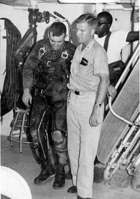 Lieutenant Commander John A. Burns (left) just after reaching the USS Jouett safely, June 19, 1968. (U.S. Navy)