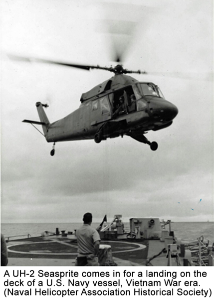 A UH-2 Seasprite comes in for a landing on the deck of a U.S. Navy vessel, Vietnam War era. (Naval Helicopter Association Historical Society)By this time, the two aviators had somehow found their way back down to the base of the hill. But as Lassen made his approach, the final overhead flare winked out. Visibility became essentially zero. Still unwilling to quit, Lassen took the extremely risky step of flipping on his landing lights, creating a blinding beam of light that allowed him to safely reach the ground, but also lit up the Seasprite itself, which became a clear target for the North Vietnamese. To cover the helicopter, as well as Holtzclaw and Burns, who were scrambling toward the aircraft, the door gunners, Dallas and West, fired furiously at the muzzle flashes peppering the distant blackness. The aviators finally reached the chopper after a final dash from the tree line, and the six men lifted off to make a beeline for the coast.