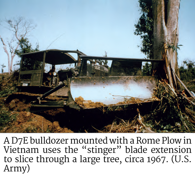 D7E BulldozerThe Rome Plow was the nickname given to a specialized bulldozer blade made by the Rome Plow Company of Cedartown, Georgia. It was stouter than a regular dozer blade, weighing about 5,000 pounds, razor sharp, and featured a “stinger” extension to one side capable of slicing down large trees. The Rome Plow mounted to a D7E military bulldozer—which weighed about 40,000 pounds. Land-clearing units cut and cleared large swathes through forest and undergrowth, exposing hidden ammunition and food supplies, tunnel entrances, and bunker complexes. Accompanying infantry and armor units engaged hidden enemy troops, collected enemy intelligence, and provided security while the engineers performed their duties.