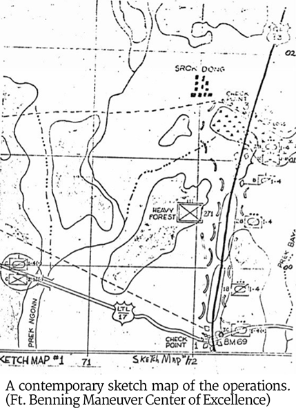 sketch map of operationsIn June 1966, the 4th Cavalry Regiment and the 18th Infantry Regiment—both of the 1st Infantry Division—often known as the “Big Red 1”—were engaged in the search-and-destroy mission called Operation EL PASO II in Binh Long Province. The 4th Cavalry troops were equipped with four M-48 “Patton” tanks and numerous armored personnel carriers (APCs). On June 30, B and C Troop of the 4th Cavalry were assigned to escort and defend a unit of engineers along a road between Loc Ninh and the 1st Infantry Division’s forward base and airfield at Hon Quan. There, the engineers were to repair a bridge at Cam Le, and the 4th Cavalry would proceed to search for enemy forces in the area along Route 13.