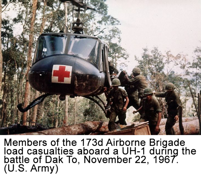 Members of the 173d Airborne Brigade load casualties aboard a UH-1 during the battle of Dak To, November 22, 1967 (U.S. Army)