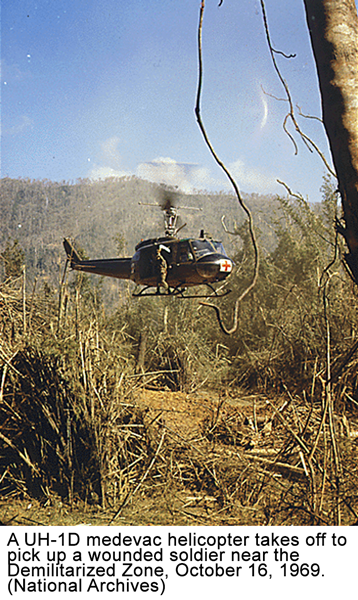 A UH-1D medevac helicopter takes off to pick up a wounded soldier near the Demilitarized Zone, October 16, 1969. (National Archives)