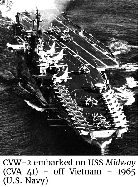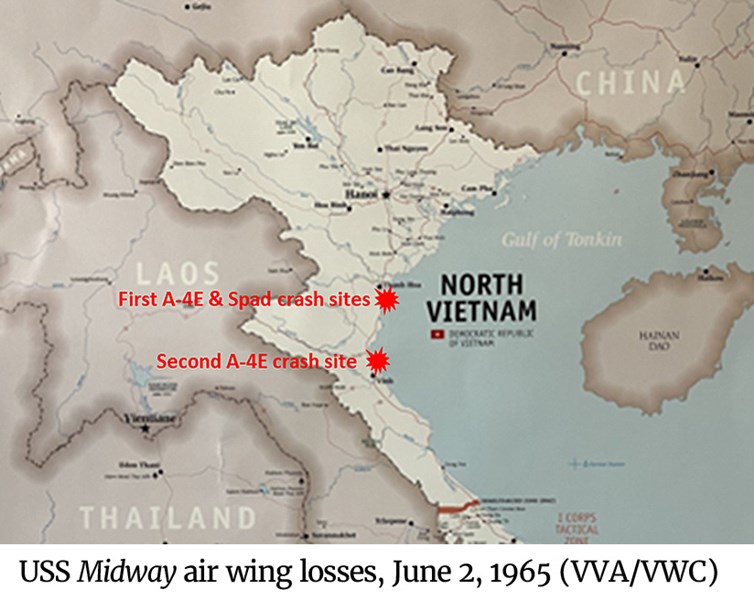 Photo of a CVW-2 embarked on the USS Midway (CVA 41) - off Vietnam – 1965 (U.S. Navy)On June 2, 1965, several flights of Douglas A-4E Skyhawks from VA-23 (the “Black Knights”), Carrier Air Wing 2 (CVW-2), USS Midway (CVA-41), as part of 7th Fleet’s Task Force 77, flew routine Operation ROLLING THUNDER missions over North Vietnam. Two aircraft from USS Midway (CVA-41) (U.S. Navy)the squadron were shot down that day.