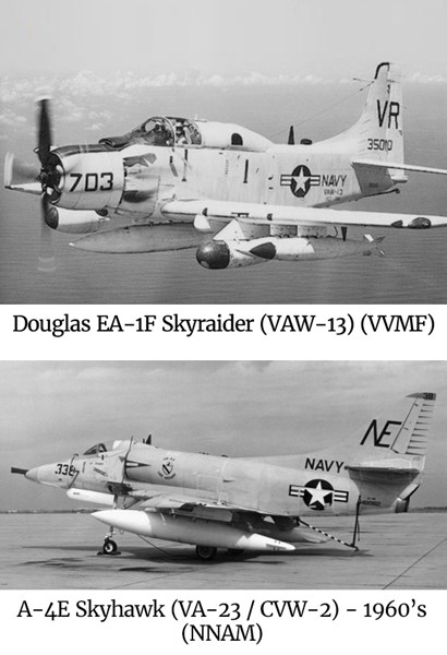 Composite image of 2 photos - a Douglas EA-1F Skyraider (VAW-13) and a 1960's A-4E Skyhawk (VA-23 / CVW-2).