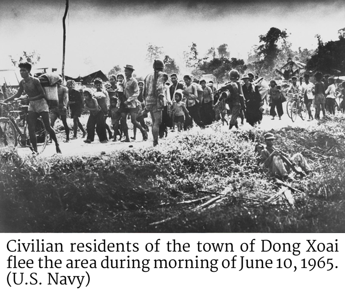 Civilian residents of the town of Dong Xoai flee the area during morning of June 10, 1965. (U.S. Navy)It was not until 1 a.m. on June 10, that American helicopters arrived overhead. These were only flare ships that could illuminate the attackers surrounding the camp, but they were unable to get close enough to retrieve any wounded due to the intensity of the ground fire. At around 2 a.m. a flight of UH-1 Huey gunships arrived and began strafing the attackers, granting the trapped headquarters building survivors a small amount of respite.