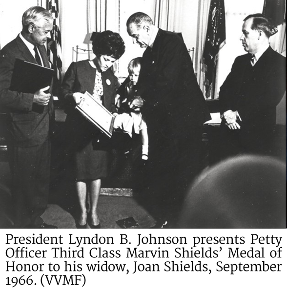 President Lyndon B. Johnson presents Petty Officer Third Class Marvin Shields’ Medal of Honor to his widow, Joan ShieldsSUMMARY: Just before midnight, on June 9, 1965, approximately 1,750 Viet Cong insurgents attacked the U.S. Special Forces camp outside of the town of Dong Xoai, Phuoc Long Province, South Vietnam. The camp’s garrison of just greater than 400 men, most of them South Vietnamese troops, awoke to mount a desperate defense. Over the next 14 hours, a pitched battle resulted in the Dong Xoai camp being partially overrun, and its defenders—as well as the South Vietnamese troops who came to their aid—being decimated. Twenty Americans were killed, along with more than 400 South Vietnamese soldiers and as many as 200 civilians. Two Americans were awarded the Medal of Honor in the wake of the battle.