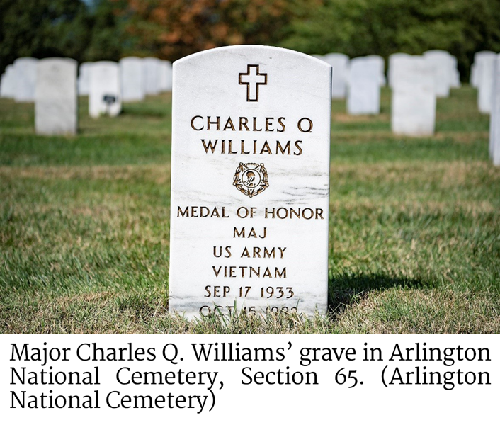 Major Charles Q. Williams’ grave in Arlington National CemeteryThe remaining survivors managed to reach one of the camp’s dug-in artillery gun pits, where they prepared to make their last stand. They radioed that they were essentially out of ammunition, but fortunately, the Viet Cong withdrew and disappeared into the jungle at the same time. Sporadic fighting did continue on the outskirts of Dong Xoai between the South Vietnamese 7th Regiment and the Viet Cong rear guard until the early hours of June 11. The Viet Cong left approximately 400 of their own dead on the battlefield.