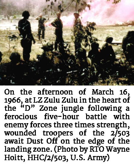 Photo from the afternoon of March 16, 1966, at LZ Zulu Zulu in the heart of the “D” Zone jungle following a ferocious five-hour battle with enemy forces three times strength, wounded troopers of the 2/503 await Dust Off on the edge of the landing zone. (Photo credit: RTO Wayne Hoitt, HHC/2/503, U.S. Army)The following morning, a patrol from Company B, 2/503 ventured into the jungle to investigate sounds heard outside perimeter during the night. At the same time, a resupply helicopter preparing to land inside the perimeter was suddenly taken under fire. The Huey "dropped out of the sky like a rock," and although none of the crew were killed, the mesmerizing sight galvanized both sides. The U.S. battalion fully manned the perimeter defenses just as the main attack began. In the jungle, the VC almost instantly killed the point man and another of the Company B patrol. The battle raged for the next several hours, but in the end, the outnumbered Americans soundly defeated the Communists, and finally drove them from the field. Seven more American Soldiers gave their lives in the struggle that day, and 162 more were wounded.