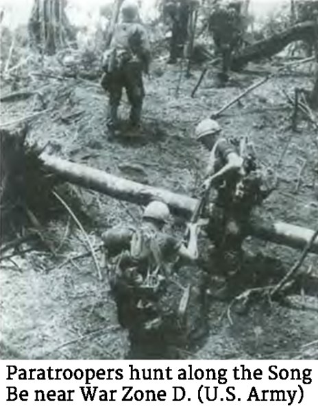 Photo of paratroopers hunting along the Song Be near War Zone D. (U.S. Army)On March 14, Company C, 2/503d encountered an enemy force entrenched with machine gun nests protected by command-detonated mines east of the Song Be. The VC showed no sign of willingly giving up their position. Artillery and airstrikes followed by an infantry charge trumped their intransigence, and they fled what turned out to be a large office and hospital complex that may have been a regional headquarters.