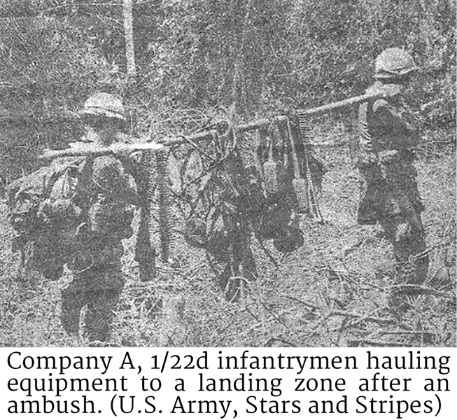 company AOn March 12, 1967, NVA mortar crews began an unprecedented, intense and sustained attack on the fire support base of the 1st Battalion, 22d Infantry also known as the “Regulars.” On March 14, Company A, 1/22d entered the jungle on a search and destroy mission to find and eliminate enemy mortar positions. As the company made its way through the thick jungle in a large V formation, the lead elements were attacked at close range. The enemy hoped to break the formation into platoon-sized or smaller fragments and overwhelm them by their numerically superior NVA regular forces. Though initial casualties were sustained, the U.S. front ranks stood firm. The ambushers backed off and circled to attack the rear, attempting to surround the company. Again, U.S. infantrymen met the attackers with unwavering resistance. Company A eventually broke through the ambush and located and destroyed the mortar pits. The surviving NVA troops retreated back into jungle. Late in the evening, Chinooks carried out the wounded Americans.