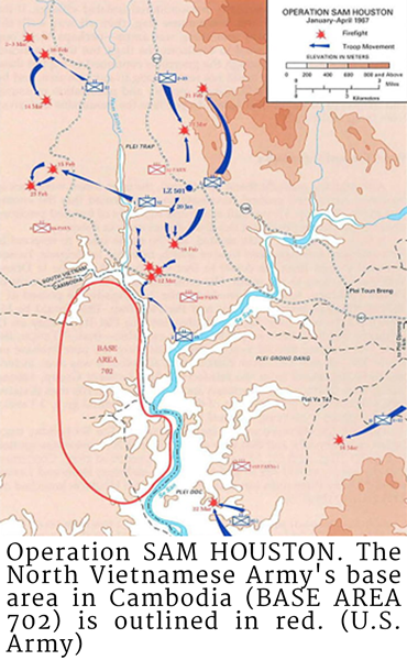 operation sam houstonFULL STORY: Operation SAM HOUSTON began January 1, 1967 to locate and close infiltration routes into South Vietnam from Cambodia, and to seek and destroy enemy units already operating in the vicinity of Pleiku and Kontum in the Central Highlands. The first month saw little action and yielded few results other than the identification of several infiltration routes and proof that they were in fact being used. The United States Army 4th Infantry Division kicked the operation into high gear on February 12 that year. It deployed two battalions from the 2d Brigade into the Plei Trap Valley along the Cambodian border in Kontum Province to find and eliminate the threat from the North Vietnamese Army’s (NVA) 1st Division already operating in the area.