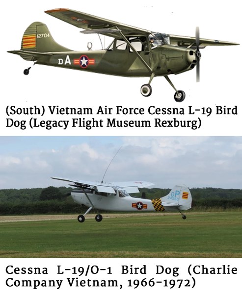 Two images of the South Vietnamese Air Force Cessna L-19 Bird Dog (Legacy Flight Museum Rexburg) (top) and the Cessna L-19/O-1 Bird Dog (Charlie Company Vietnam, 1966-1972) (bottom).The U.S. Air Force’s 19th Tactical Air Support Squadron stood up in July 1963 at Bien Hoa Air Base in South Vietnam under the 34th Tactical Group. The squadron trained South Vietnamese pilots in the Cessna O-1 Bird Dog (“O” for observation), formerly designated the L-19A (“L” for liaison), and flew missions for the South Vietnamese Air Force, often both at the same time. The military used the moniker “Bird Dog” because the aircraft provided capabilities not unlike those of hunting dogs: locate the prey and stay on point until the hunter’s gun is brought to bear. They were especially effective for forward air control, combat support liaison, and reconnaissance missions. The arrival of an O-1 FAC on target quite reasonably struck fear in the enemy. It meant that precisely targeted guns and bombs were not far behind.