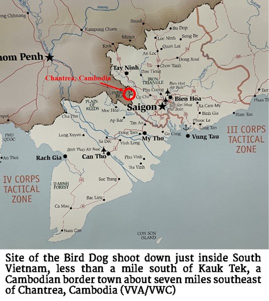 Map of the site of the Bird Dog shoot down just inside South Vietnam, less than a mile south of Kauk Tek, a Cambodian border town about seven miles southeast of Chantrea, Cambodia (VVA/VWC)By 1964, while still technically neutral, the North Vietnamese Army and the Viet Cong used Cambodia as a safe haven. On March 11, 1964, violent RKG-sanctioned protesters carrying “U.S. go home” placards threw rocks at the U.S. Embassy in Phnom Penh. That same month, according to a memorandum sent home from the U.S. Embassy in Phnom Penh, a Cambodian diplomat in Paris completed a comprehensive study on Cambodia’s eastern frontier. Prince Sihanouk had earlier proposed that “France and the states of the former French Indochina meet to discuss and settle definitively their common boundaries.” There were disputes. The study’s conclusions may have reignited Sihanouk’s dissatisfaction with Cambodia’s French-imposed borders with both Laos and South Vietnam.