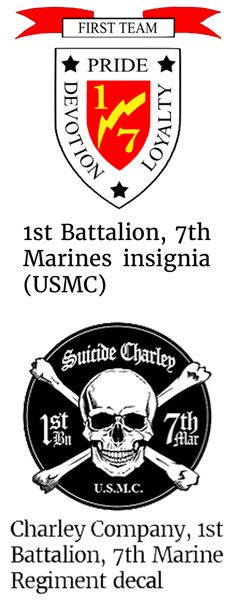 Composite graphic of the 1st Battalion, 7th Marines insignia (top) and the Charley Company, 1st Battalion, 7th Marine Regiment decal below it. SUMMARY: About 2:30 p.m. on March 28, 1966, Company C (“Suicide Charley”), 1st Battalion, 7th Marine Regiment (1/7 Marines), 1st Marine Division came under fire from a heavy weapons battalion of the 21st North Vietnamese Army (NVA) Regiment concealed in the hamlet of Vinh Loc (2), several miles northwest of Quang Ngai City, the provincial capital. After three hours of intense fighting, Charley Company fell back to allow air power and Marine artillery to engage the Communist forces. Company C, 1/7 Marines lost ten men killed in battle that day, and with them an attached artillery forward observer from G Battery, 3d Battalion, 11th Marines (3/11 Marines). Forty five Marines were wounded. It was Suicide Charley’s most costly victory since arriving in Vietnam. It was also a day of extraordinary heroism. A Navy corpsman serving with Company C was awarded the Medal of Honor for his selfless and heroic actions in the battle. One of the names on the casualty list was a false identity.