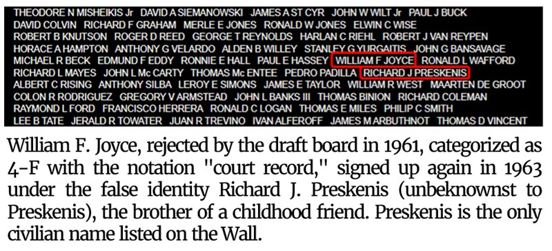 • Private First Class William Francis Joyce, rifleman, was born November 16, 1940 in Hyde Park, Massachusetts. He was 25 years old. (William F. Joyce served in the Marine Corps under an alias as Richard J. Preskenis, who was the brother of a childhood friend of Joyce, a civilian, and very much alive when his name was inscribed on the Vietnam Veterans Memorial Wall.)
