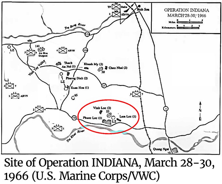 On the afternoon on March 28, 1966, the 1/7 Marines launched Operation INDIANA, a short mission to reinforce the 3d Battalion, 5th Regiment, 2d ARVN Division. The ARVN battalion had remained near the hamlet of Lam Loc (1), a little over a mile east of Phuoc Loc (1), following Operation TEXAS/LIEN KET 28, and was again in contact with the 21st NVA Regiment. The 1/7 Marines were dropped off by Marine Aircraft Group 36 (MAG-36) helicopters just over a mile from their ARVN allies, near the hamlet of Vinh Loc (2), to act as a blocking force.