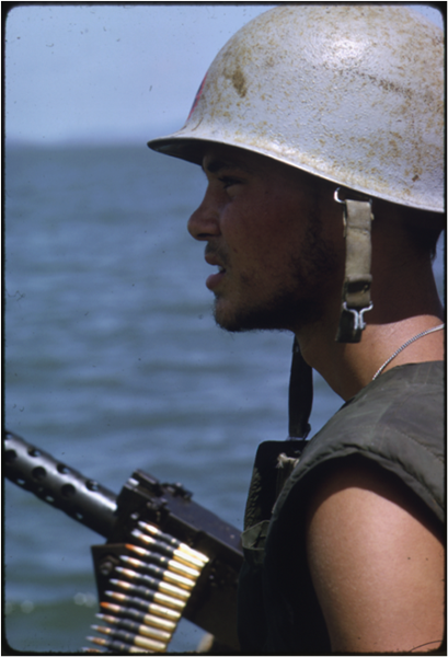 A U.S. Navy Sailor mans a .50-caliber machine gun during Operation JACKSTAY in the Rung Sat Special Zone, March 26, 1966. (National Archives)
