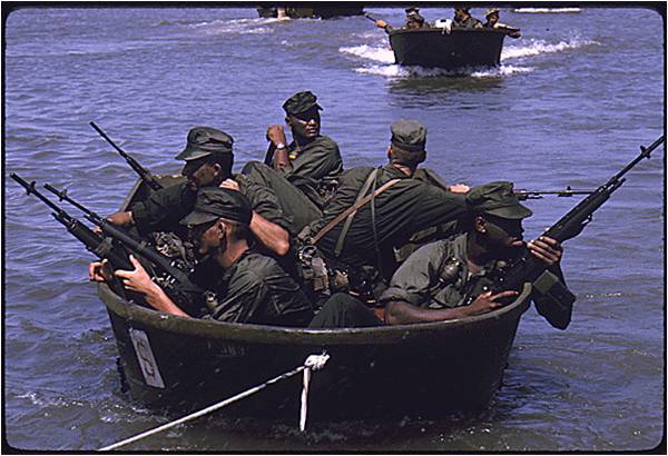 National Archives photo of U.S. Marines in outbound motor boats approaching their landing site in the Rung Sat Special Zone during Operation JACKSTAY, March 26, 1966. Week of