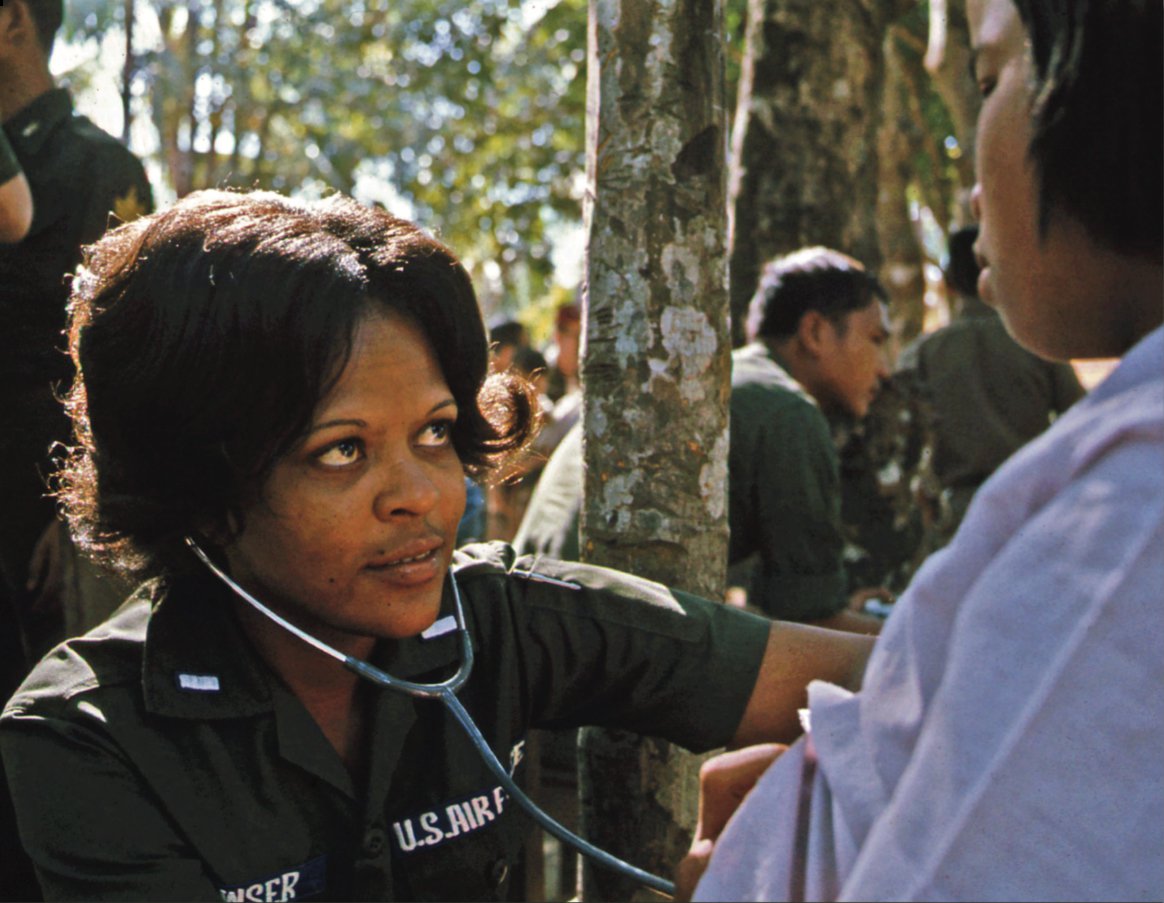 First Lieutenant Linda J. Bowser, an Air Force nurse with a MEDCAP team, examines a Thai girl, Bong Son Village, Thailand, January 10, 1974. (U.S. Air Force)