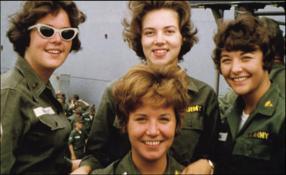 Four Army nurses assigned to the 85th Evacuation Hospital at Qui Nhon photographed on September 1, 1965. Front: First Lieutenant Joan Schwerman; back, left to right: First Lieutenants Kathleen Gilluly, Sharon Forman (later Bystran), and Mary Rum (later Caspers). (Sharon Bystran Collection, Women's Memorial Foundation Collection)