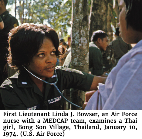 Photo of First Lieutenant Linda J. Bowser, an Air Force nurse with a MEDCAP team, examines a Thai girl, Bong Son Village, Thailand, January 10, 1974. (U.S. Air Force)