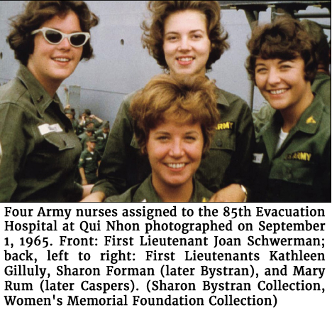 Photo of four Army nurses assigned to the 85th Evacuation Hospital at Qui Nhon photographed on September 1, 1965. Front: First Lieutenant Joan Schwerman; back, left to right: First Lieutenants Kathleen Gilluly, Sharon Forman (later Bystran), and Mary Rum (later Caspers). (Sharon Bystran Collection, Women's Memorial Foundation Collection)