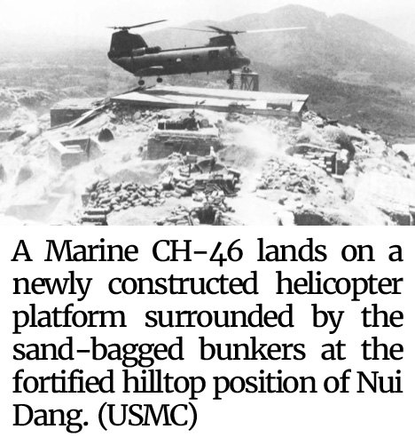 Photo of a Marine CH-46 landing on a newly constructed helicopter platform surrounded by the sand-bagged bunkers at the fortified hilltop position of Nui Dang. (USMC)