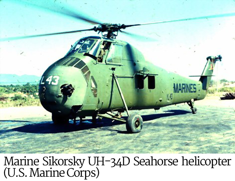 marine sikorskySUMMARY: On March 10, 1963, a U.S. Marine Corps Sikorsky UH-34D Seahorse helicopter from Marine Medium Helicopter Squadron 162 (HMM-162), crashed attempting to rescue a downed Army OV-1C Mohawk pilot. The crash site was approximately 5,000 feet above sea level in the jungle-covered Annamite Mountains in northern II Corps, about