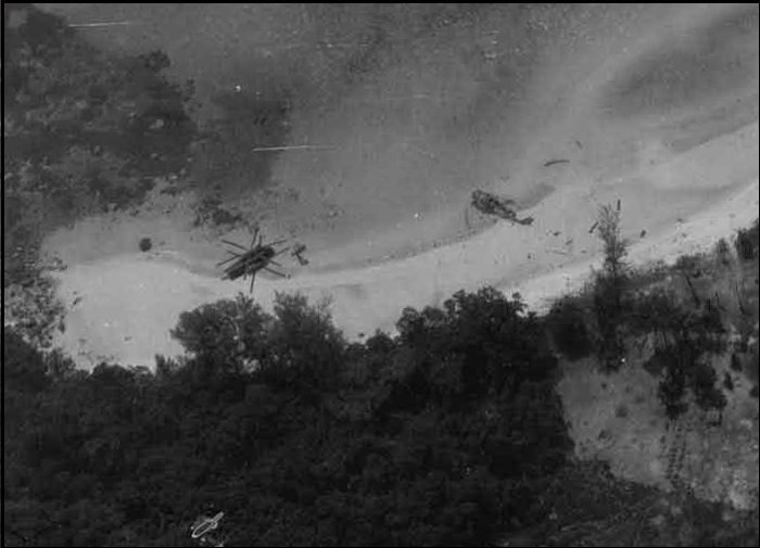 Marines and Airmen on Koh Tang move toward a CH-53 Sea Stallion. 13 men were killed when one CH-53 was shot down just off the beach as the assault got underway. (U.S. Air Force)