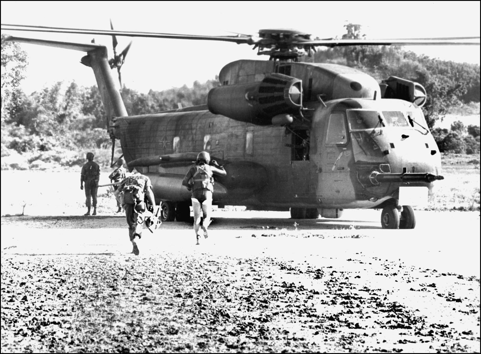 Marines offloading from a CH-53 Sea Stallion helicopter after landing on Koh Tang island, May 15, 1975. (U.S. Air Force)