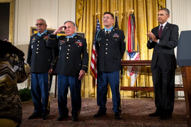 Specialist Four Santiago Erevia (right), alongside Jose Rodela and Melvin Morris, receives the Medal of Honor from President Barack Obama at the White House, March 18, 2014. (White House)