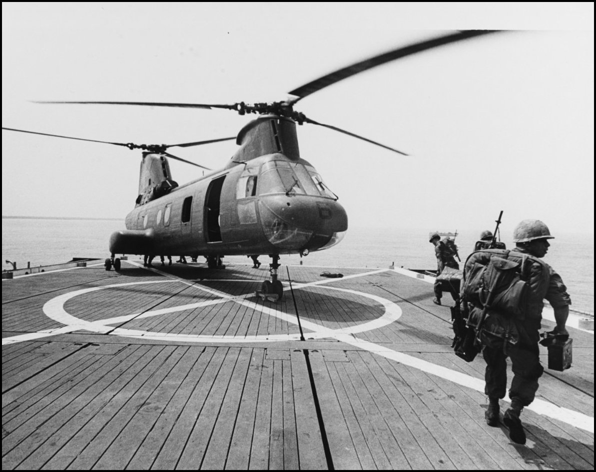 U.S. Marines preparing to board a CH-46 Sea Knight helicopter on the deck of the USS Monticello (LSD-35), March 21, 1967. (U.S. Navy)