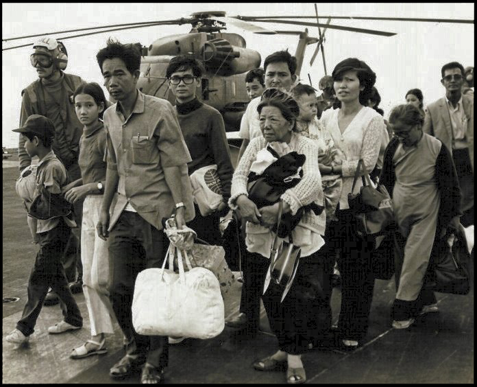 South Vietnamese refugees walk across the deck of an American vessel after evacuating from Saigon, April 29, 1975. (National Archives)
