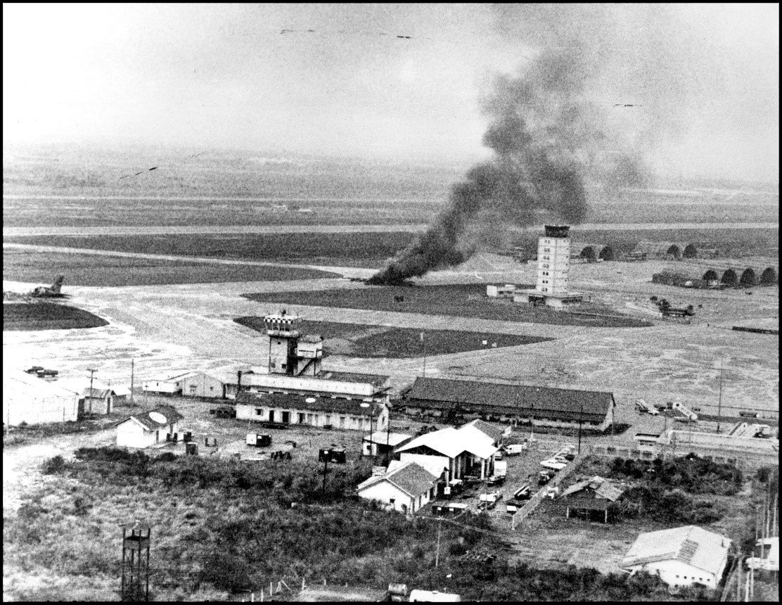 An aircraft burns on the runway at Tan Son Nhut Air Base after being hit by North Vietnamese artillery fire, April 29, 1975.