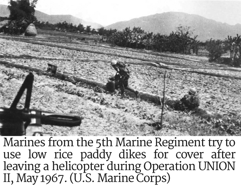 Photo of Marines from the 5th Marine Regiment try to use low rice paddy dikes for cover On May 26, 1967, the 5th Marines launched Operation