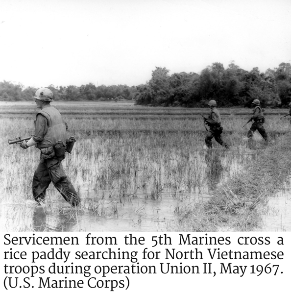 Photo of Servicemen from the 5th Marines crossing a rice paddy searching for North Vietnamese troopsThe men of Company L scrambled to find what cover they could against the low earthen berms of the rice paddy, but the North Vietnamese, entrenched at the other end, began firing machine guns and mortar rounds that made short work of these feeble defensive positions. The Marines withdrew to a tree line to their rear, but most remained pinned by the volume of fire and were unable to move. Casualties mounted rapidly.